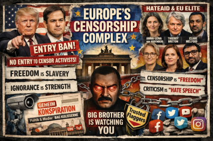 EU-kommissionen, europæiske statsledere og deres statsbetalte medier fordømmer naturligvis det amerikanske visumforbud. Frankrigs præsident Macron taler om ”tvang og intimidering”, TV2 og en professor i ”cybersikkerhed” på Ålborg Universitet kalder det amerikanske forsvar for ytringsfriheden for - ”ildevarslende”. Men i en grundig og afslørende artikel i det uafhængige tyske medie NIUS afdækker journalisten Pauline Voss tætte bånd mellem etablerede politiske magtpartier (CDU, CSU, SPD, die Grønne, die Linke) og det censurindustrielle kompleks i Tyskland, som systematisk arbejder for indgreb og indskrænkninger i borgernes ytringsfrihed, særlig på sociale medier. Ifølge Pauline Voss arbejder statsstøttede organisationer som bl.a. HateAid aktivt for politisk censur og sikrer sin portvogter-rolle gennem knæsætningen af en nærmest Orwellsk fortælling i offentligheden. HateAid har således etableret sig som uofficiel censurmyndighed i den tyske mediemainstream ved gentagelsen og ophøjelsen af tre simple propagandaløgne: 1. Censur er "ytringsfrihed". 2. Ytringsfrihed uden censur er "hadefuld tale". 3. Kampen mod censur er et "angreb på ytringsfriheden". Marco Rubio og Trump-regeringens visumforbud sætter altså fingeren på et reelt og alvorligt problem for friheden i Vesten og Europa.